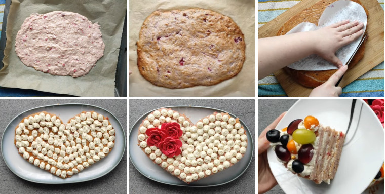 Распределять коржи мы будем с помощью лопатки, на противне, застеленном пергаментом. Из данного количества теста должно получиться 4 коржа. Выпекаем коржи в разогретой духовке на 170 градусов, до готовности. Даем остыть. Имейте в виду, что остывшие коржи становятся более плотными, а горячие разваливаются. С помощью бумажного сердечка вырезаем 4 сердца из коржей.