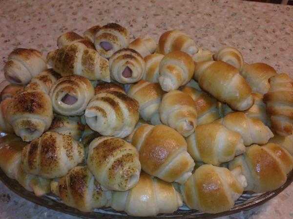 Замесить тесто, разделить на три шара. Посыпать мукой и оставить в теплом месте подниматься. Каждый шар раскатать и разрезать на 16 треугольников. Раскатать тесто до толщины 2 мм.