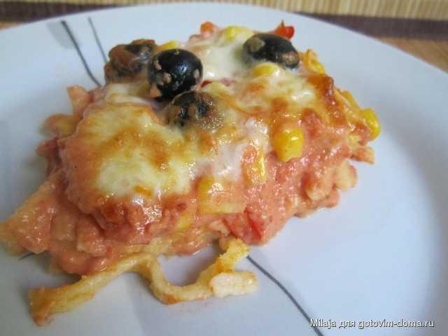 Сверху выкладываем вашу любимую начинку, посыпаем обильно тёртым сыром.