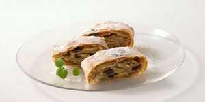С помощью салфетки сверните пласт в рулет, начиная с той стороны, на которую выложена яблочная начинка. Переложите штрудель на противень, смазанный сливочным маслом, выпекайте 30 минут при 200 С, охладите. При подаче штрудель посыпьте сахарной пудрой и нарежьте ломтиками.