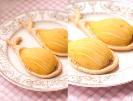 Слоеное тесто немного раскатываем и вырезаем 12 пирожных по форме груш, но больше на 2 -3 см. Выкладываем их на застеленный бумагой для выпечки противень, из обрезков теста делаем листочки. Миндальную начинку выкладываем в серединку каждого кусочка теста.