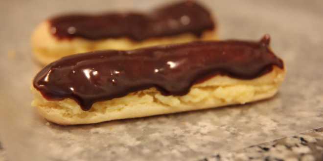 4. На противень, смазанный жиром, выложить порциями тесто в форме удлиненных овалов длиной 8-10 см. Для этого можно воспользоваться кондитерским мешком или смоченной водой силиконовой лопаточкой (spatula). В процессе выпечки эклеры увеличатся в размере, поэтому нужно оставить между ними достаточно места.