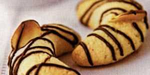 Шоколад наломать, растопить на водяной бане, переложить в полиэтиленовый пакетик, срезать уголок и нанести на рогалики шоколадные линии.
