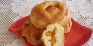 Разделить тесто на маленькие шарики, прижимая шарик рукой, положить кусочки персика. По бокам сделать надрезы и завернуть один край в другой.