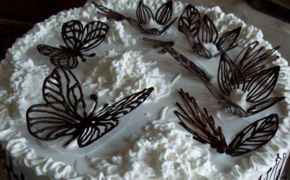 Далее достаем уже растопленный шоколад из воды, промакиваем пакетик салфеткой, таким образом убирая всю влагу. На пакетике отрезаем маленький уголочек и приступаем к изготовлению шоколадной бабочки. Рисовать начнем с контура. Сначала прорисовываем одну половину, а затем вторую. Далее рисуем туловище, оно скрепляет две половинки, т. е. крылья бабочки. Серединку крыльев зарисовываем рисунком в виде сеточки. Рисунок, который на картинке соблюдать не обязательно, главное, чтобы все линии были скреплены между собой. Такая сеточка, поможет закрепить всю конструкцию между собой. В основных местах соединения, шоколада можно не жалеть, это лишь усилит всю конструкцию. Далее рисуем усики. И вот бабочка почти готова, осталось лишь ее просушить в определенной форме.