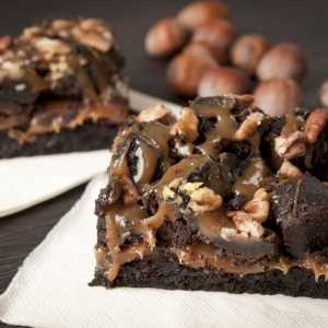 На нижний корж полодить шоколадный крем, распредилите кубики из коржа, посыпьте измельченными грецкими орехами. Полить шоколадный торт карамелью и оставить в холодильнике на 2 часа. Порезать на порционные куски.