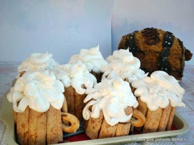 Белковым кремом через мешок наполняем их, имитируя пивную пену.