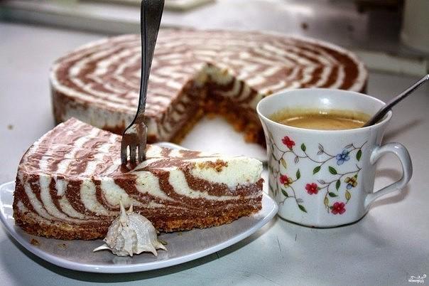 - Добавьте шоколад во вторую половину творожной массы, перемешайте, также добавьте и желатин. У нас получилось две массы для начинки. Теперь достаньте форму из холодильника и соберите торт: выкладывайте по 5 столовых ложек шоколадной и белой творожной массы, чередуя, одну на другую, пока не закончатся.