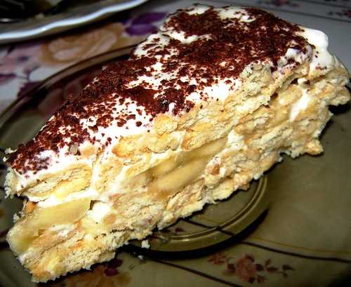 Довольно оригинальный тортик: слоистый, пропитанный кремом, с приятным банановым вкусом и не надо выпекать.