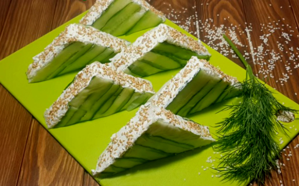 Из всех продуктов получается 3 квадратных бутерброда. Отправляем заготовки в холодильник, примерно минут на 15-20. Тем временем, на сухой сковороде обжариваем кунжут до золотистого цвета. Остывшие зернышки высыпаем в отдельную посудину. После чего достаем бутерброды из холодильника и полностью освобождаем от пленки. С помощью острого ножа, все неровности обрезаем. Далее разрезаем каждый кусок по диагонали. Из одной квадратной заготовки должно получиться два ровных кусочка треугольной формы. Бока бутербродов промазываем сыром, после чего присыпаем зернышками кунжута. Оригинальную закуску выкладываем на тарелочку и можно подавать к столу. Теперь вы сможете неожиданно удивить и порадовать своих гостей, этими чудо-бутербродами.