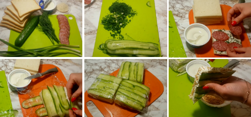 И так, все готово, приступаем к сборке закуски. Первый кусок хлеба намазываем сливочным сыром (тонким слоем), сверху присыпаем укропом и следующим слоем выкладываем колбасу. Откладываем заготовку в сторону. Со вторым кусочком хлеба проделываем то же самое, но уже присыпаем луком. Намазанной стороной (с луком) накрываем хлеб с колбасой, сверху вновь наносим тонкий слой сыра и покрываем огуречными пластинами. Накрываем пищевой пленкой, переворачиваем и с обратной стороны хлеб также промазываем тонким слоем сыра, после чего снова выкладываем огурцы. Лишнее обрезаем и готовый бутерброд полностью, со всех сторон оборачиваем пленкой.