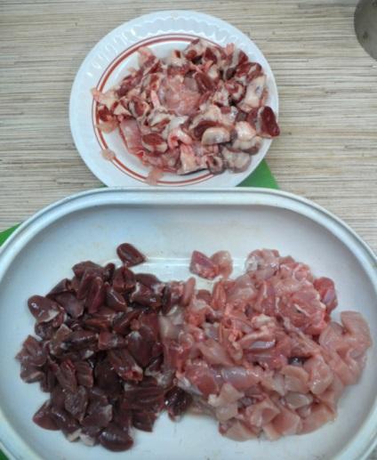 Курицу (при необходимости отделить о кости), сало и печень режем на небольшие (2-2,5см.) кусочки и складываем в посуду. Курицу можно частично заменить куриными субпродуктами (сердце, желудок).
