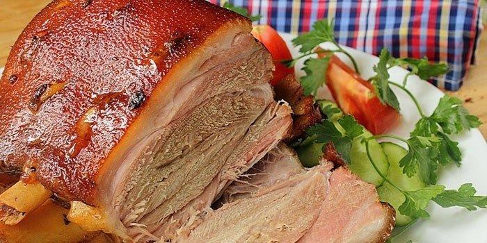 - Обильно смазываем полученной смесью рульку. Выкладываем ее на противень, смазанный растительным маслом, и отправляем в разогретую до 200 °C духовку на 30-35 минут. Когда отмеченное время пройдет, печь выключают, а мясо оставляют еще на 25 минут.