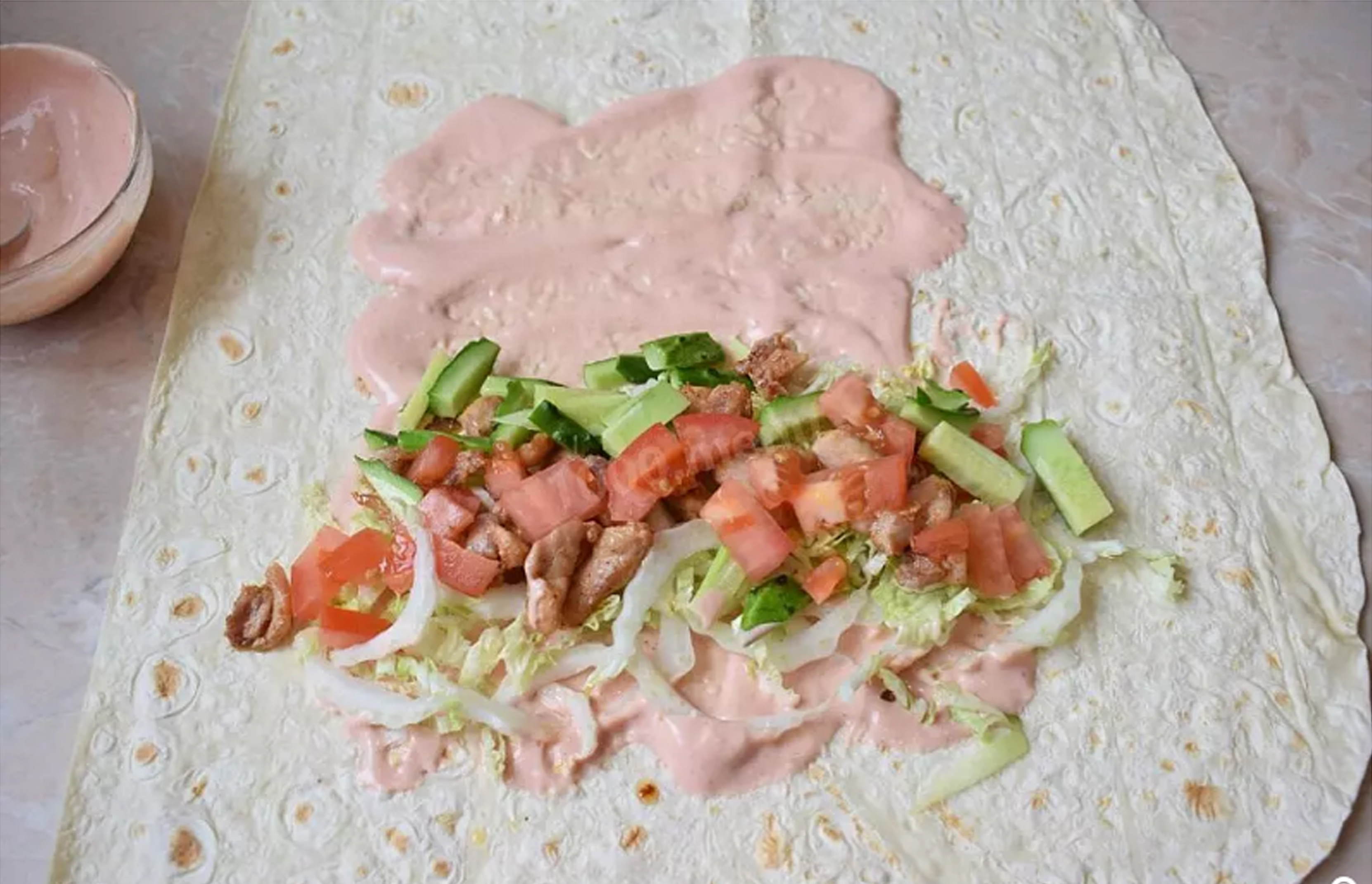- Положить на стол кусок лаваша и смазать его приготовленным соусом или кетчупом и майонезом. Края лаваша смазывать не нужно. Добавляем нарезанную капусту.