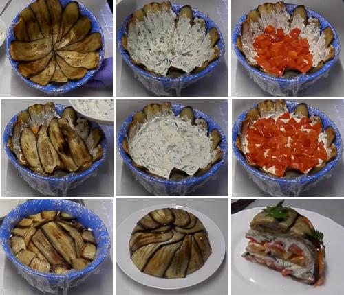 В миску, застеленную пищевой пленкой, выкладываем баклажаны внахлест. Далее сырную массу наносим на дно и бока баклажанов. Оставшуюся сырную смесь зрительно разделите пополам и одну часть выложите просто на дно. Вторым слоем выкладываем ½ часть перца. Третьим слоем все помидоры. Далее слой баклажанов и сверху выкладываем всю оставшуюся часть сырной массы. Затем выкладываем оставшийся перец и накрываем все баклажанами. В завершении тортик накрываем тарелкой, сверху ставим груз не более 1 кг. В таком виде закуску отправляем в холодильник на 5-6 часов. По истечению времени, торт достаем из холодильника, сливаем всю образовавшуюся жидкость, переворачиваем на блюдо, освобождаем от пленки, украшаем овощами на свой вкус и можно подавать к столу.