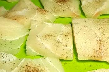 Рыбное филе моем, сушим и делим на порционные кусочки. Рыба для данного рецепта подойдет любая. Главное, чтобы кусочки были не очень большими и толстыми. В нашем случае это спинка трески. Все кусочки солим, перчим с обеих сторон и отставляем на некоторое время в сторону. Петрушку и укроп мелко нарезаем. Рыбные кусочки складываем в миску, сбрызгиваем соком выжатого лимона и пересыпаем мелко нарезанной зеленью. Зелень хорошенько распределяем по всем кусочкам и даем рыбе пропитаться ароматным соусом из зелени и сока, примерно 30 минут. Пока филе будет настаиваться, мы тем временем приступим к приготовлению других продуктов.