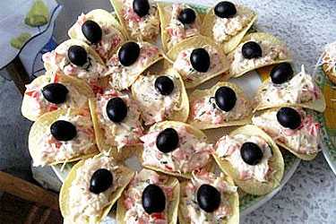 выложить закуску, маслины разрезать на две части и выложить сверху.