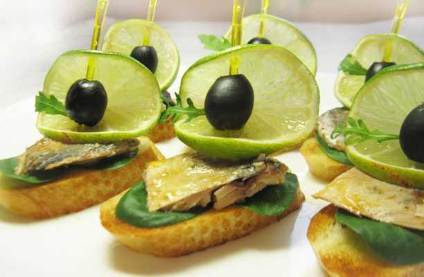 На жареные тосты выложите по листику салата, затем по кусочку скумбрии и в вставьте по шпажке с лаймом.