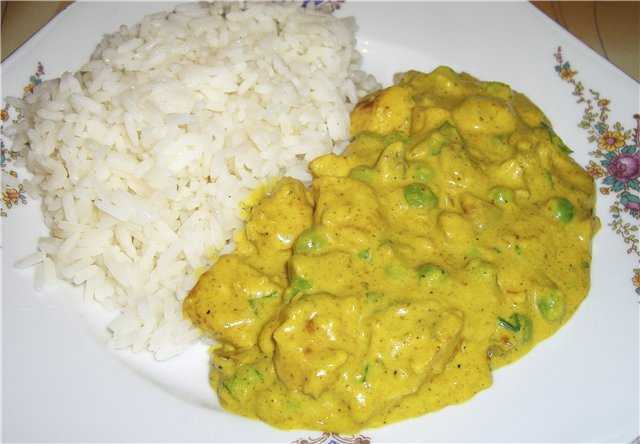 Доведите карри до кипения, уменьшите огонь и проварите 5-7 минут. Добавьте горошек, приправьте перцем и солью. Готовьте ещё 3 минуты на тихом огне. Мясо верните на сковородку с карри, прогрейте его.