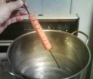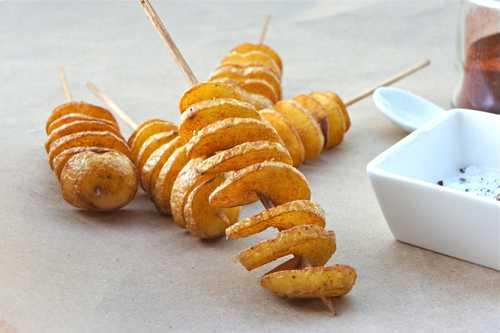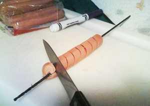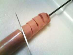 Например, сосиска: наденьте ее шампур и начинайте надрезать, потихоньку поворачивая шампур по часовой стрелке. При этом старайтесь не прорезать сосиску до шампура. Теперь можете ее жарить или варить.