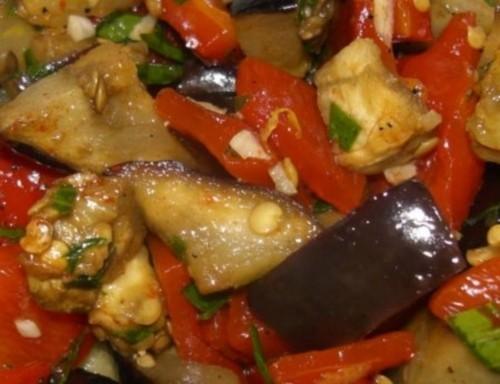 Баклажаны нарезать колечками, обжарить с двух сторон. Перец и чеснок пропустить через мясорубку, смешать с маслом, солью и уксусом. Добавить баклажаны в соус, прокипятить, разложить по стерилизованным банкам и закатать.