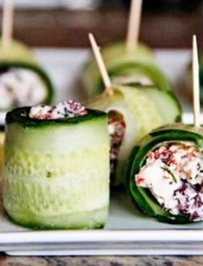 В начале каждой полоски огурца положить столовую ложку смеси.