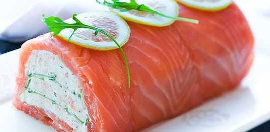 4. Выложите третью часть начинки в форму. Затем поместите половину шпината и добавьте еще треть массы. Распределите по всей поверхности остатки шпината и выложите сверху остальные начинки. Накройте все это пластинками рыбы, заверните в пищевую пленку и поставьте в холодильник на 3 часа. Готовое блюдо выньте из формы и снимите пленку. Перед подачей на стол украсьте террин дольками лимона и свежей зеленью.