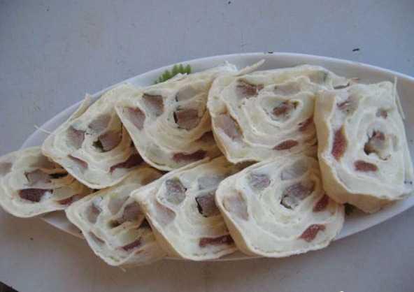 Лаваш смазать майонезом, разложить по нему пюре, положить нарезанное вдоль на полоски филе селедки на разном расстоянии, плотно свернуть лаваш в рулет (можно с помощью пищевой пленки) и поместить его в холодильник хотя бы на 30 мин. При подаче нарезать на кусочки и уложить на блюдо.