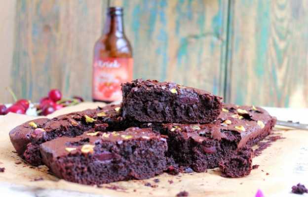 Разогреть духовку до 180 градусов. Смазать дно прямоугольной формы для выпечки 20-25 см и накройте бумагой для выпечки, посыпать какао. На водяной бане растопить шоколад и масло, добавьте сахар и перемешать, пока он не растворится (если сахар не тает полностью, это не смертельно). Снимите смесь с огня. Добавить яйца по одному, пока они не взобьются, а затем залить пивом, а затем положить муку и какао. Распространите смесь в форме и посыпать черешней и орехами. Выпекать 20-25 минут, проверьте готовность палочкой. Остудить и разрезать на квадраты.