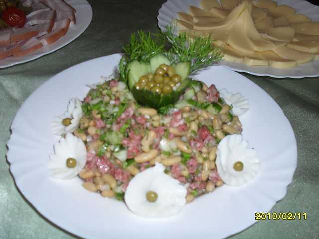 Копченую колбасу порезать соломкой. Огурец порезать соломкой. Лук, яйцо, зелень мелко нарезать. Все ингредиенты соединить, заправить майонезом.