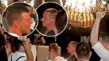 На кадрах футболисты курят кальян под российский гимн. Видно, как им выносят большое количество бутылок с шампанским, украшенных бенгальскими огнями.