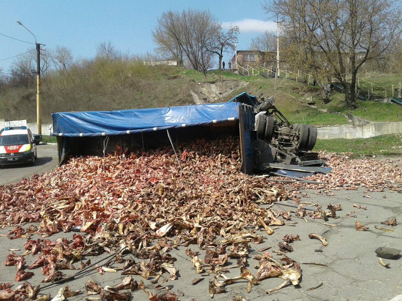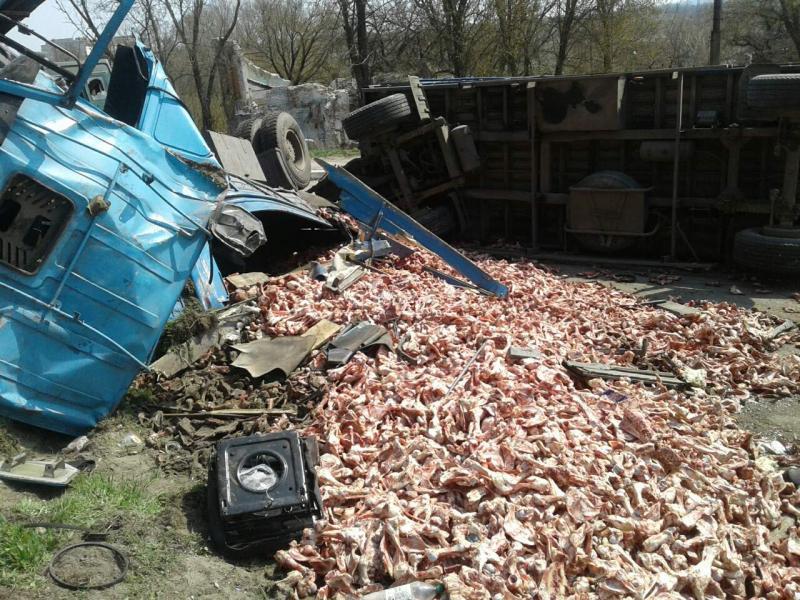 Грузовой автомобиль во время дорожно-транспортного происшествия перевернулся, и на дорогу высыпались кости - сырье, которое должны были доставить на "Лисичанский желатиновый завод". Маршрутное такси съехало с дороги и зависло над оврагом. Обе машины превратились в груду металла.