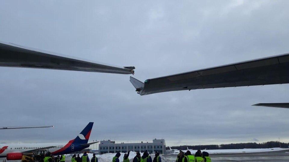 Сообщается, что лайнер с пассажирами на борту во время буксировки задел крылом хвостовое оперение стоящего на перроне другого самолета Boeing-767 авиакомпании Azur Air.