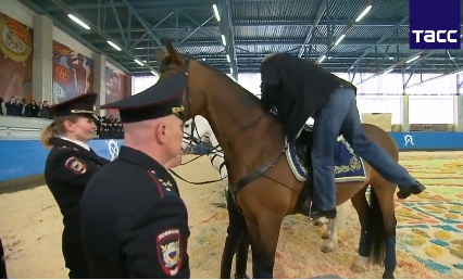 Дело происходило во время посещения Путиным 1-го оперативного полка полиции главного управления МВД РФ по Москве, куда его пригласили сотрудницы конной и туристической полиции.