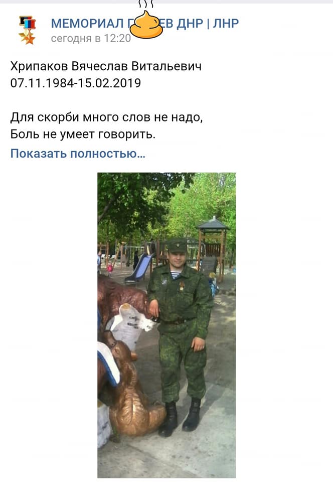 Также стало известно, что 15 февраля был ликвидирован боевик из Славянска Хрипаков Вячеслав Витальевич 1984 г.р. с позывным "Слива". Террорист воевал в рядах НВФ с лета 2014 года.