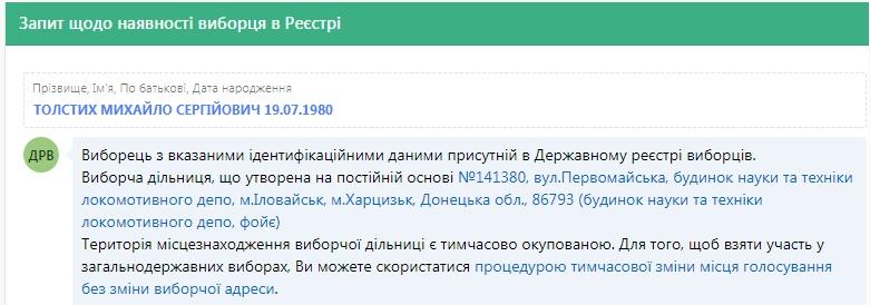 Также, в реестре избирателей числится погибший экс-глава непризнанной «ДНР» Александр Захарченко, коорый погиб 31 августа 2018 года в Донецке в результате взрыва в кафе. Его избирательный участок находится на вул. Колодина в Донецке.