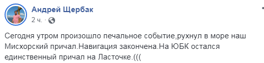 "Сегодня утром произошло печальное событие. Рухнул в море наш Мисхорский причал. Навигация закончена...", - написал Андрей Щербак и прикрепил к своему посту печальное фото, подчеркнув, что по всему ЮБК остался всего один подобный причал.