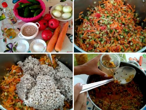 Репчатый лук нарезаем мелкими кубиками и отправляем к томатам. Морковь чистим, перетираем на крупной терке и также отправляем в овощную массу. Огурцы нарезаем мелкими кусочками и отправляем к овощам, но для начала убедитесь, чтобы огурцы не горчили. Дополняем все солью, сахаром и хорошенько перемешиваем. Содержимое кастрюли ставим на огонь и ждем закипания. После того, как овощи закипят, убавляем температуру и все варим 20 минут. После 20-минутной варки в заправку добавляем уксус и перловку. Всю овощную массу хорошенько перемешиваем и варим на слабом огне еще 10 минут.