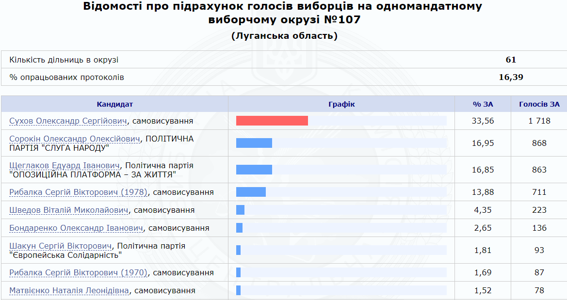 Среди кандидатов-мажоритарщиков пока уверенно лидирует Александр Сухов - представитель команды нардепа Сергея Шахова, член партии "Наш край". За него отдали голос 33,56% избирателей округа.