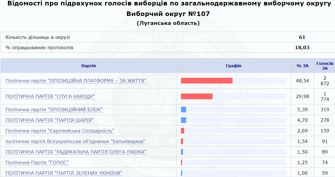 Также практически половина избирателей 107 округа проголосовала за партию "Оппозиционная платформа - За жизнь" (48,54%), "Слуга народа" набирает почти 30%.