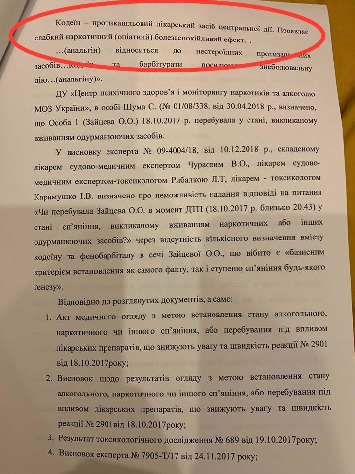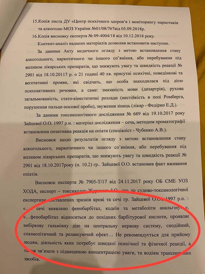 Представительница пострадавших Лариса Матвеева инициирует против них уголовное производство - основой станет заключение психиатра-нарколога Бориса Михайлова - доктора медицинских наук, профессора кафедры психотерапии Харьковской медицинской академии последипломного образования, который изучил документы по делу и заявил - Зайцева находилась под действием лекарственных препаратов с наркотическим эффектом, и для определения этого не надо знать количество опиатов - достаточно лишь факта наличия препарата в организме, а нормативно-правовых документов, определяющих количество наркотических веществ, в Украине не существует.