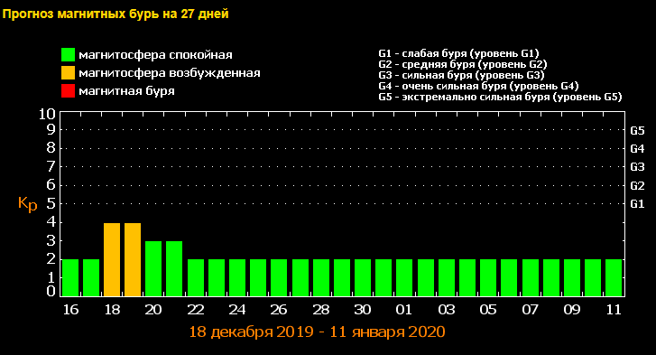 До уровня магнитной бури колебания магнитосферы не дотягивают, однако 18-19 декабря прогнозируется ее существенное возбуждение. Отголоски этого процесса могут ощущаться 20-21 декабря.
