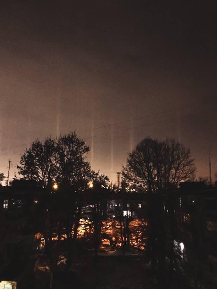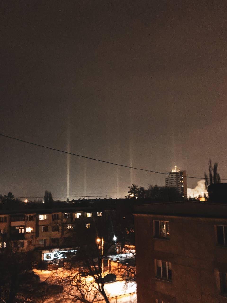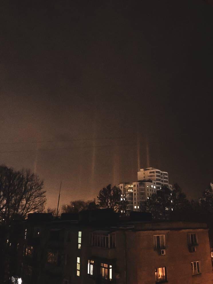 В эти морозные дни в городе Черноморске Одесской области можно наблюдать редкое и красивое явление - световые столбы.