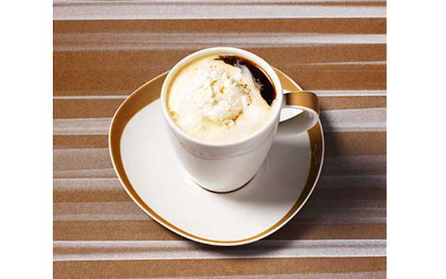 Приготовьте кофе-эспрессо. Положите 1 столовую ложку ванильного мороженого на дно чашки и аккуратно вылейте на него приготовленный эспрессо. Сверху полейте взбитыми сливками. По желанию, можно украсить тертым шоколадом и смесью с перцем чили.