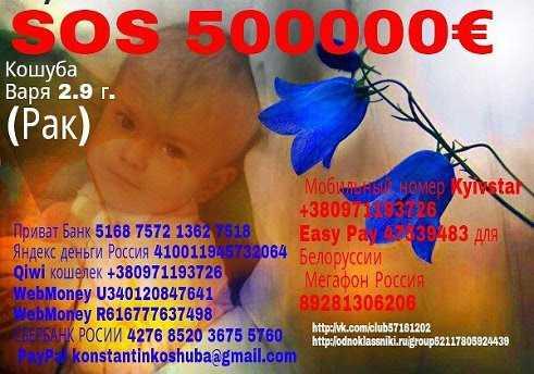 Но, к сожалению, лечение не принесло результатов, и состояние ребенка остается тяжелым. Единственная клиника, которая сейчас готова принять Варюшу Университетская клиника им. Г. Гейнца в Дюссельдорфе. Родителями был получен счет на лечение, который поверг семью в шок - 500 000 евро. Лечение нужно начинать как можно быстрее, т.к. опухоль прогрессирует, а клиника может принять только при наличии на счету всей необходимой суммы. Без посторонней помощи им не обойтись. Мы очень просим Вас - услышьте и помогите спасти ребенка!!!