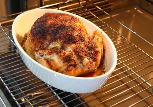 Приправьте курицу солью и перцем, положите в форму, залейте ее растопленным маслом и оливковым маслом, добавьте 1/2 стакана воды и выпекайте 20 минут в предварительно разогретой духовке до 220 градусов. Затем уменьшите жар до 180 градусов и запекайте еще около 35 минут.
