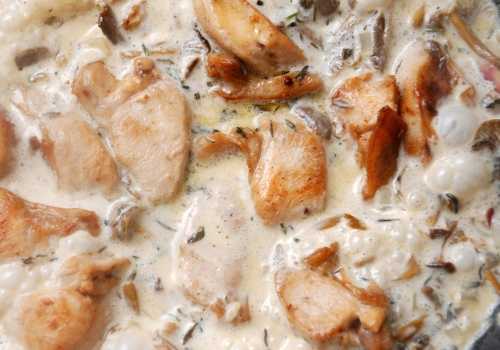 Ингредиенты: белое куриное мясо - 500 г, лук репчатый - 1 головка, масло - 3 ст. л., мука - 3 ст. л., сметана - 1 стакан, бульон - 1 кубик, горчица - 1 ч. л., мускатный орех, соль.