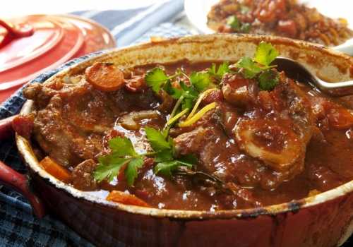 Ингредиенты: телятина или говядина - 900 г, лук репчатый - 350 г (небольшие головки), помидоры — 4 шт., морковь — 2 шт., чеснок - 2 зубчика, лимон - 1 шт., красное вино - 300 мл, бульон - 150 г, мука - 4 ст. л., петрушка - 1 ст. л. рубленной, базилик, тимьян, оливковое масло, черный перец, соль.
