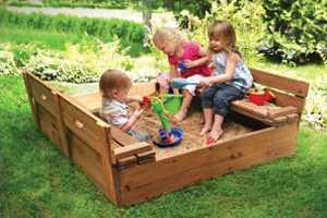 Перед тем, как сделать песочницу, снимите слой земли глубиной до 50 см, а чтобы вода не собиралась в ней, сделайте в сторону центра песочницы небольшой уклон, положите пленку или сетку и засыпьте песком.