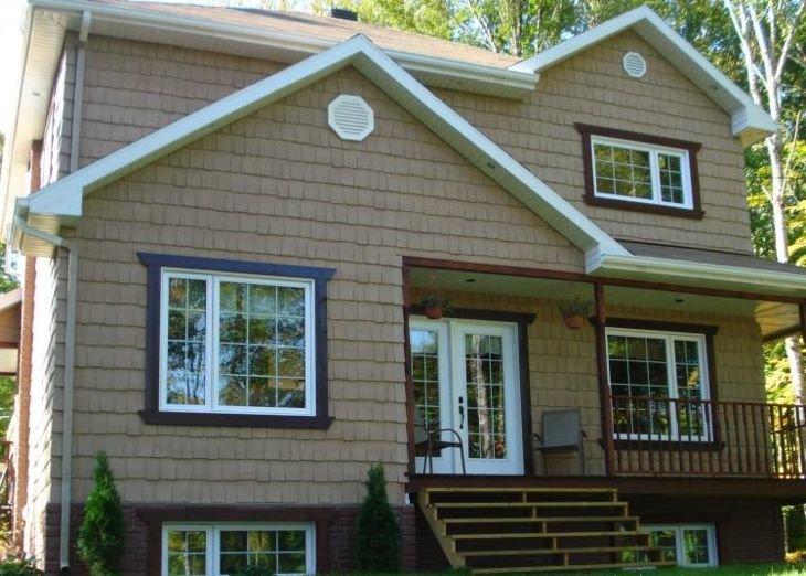 Сайдинг великолепно показал себя в загородном домостроении, так как доступен и достаточно легок в установке. Крепление панелей производиться либо в стык, либо внахлест на рельсовом каркасе при помощи оцинкованных гвоздей.